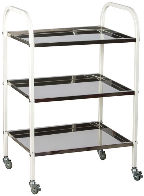 - Полки образуют три уровня хранения. Выполнены из высокопрочной нержавеющей стали 0.8 мм, устойчивой к возникновению трещин и сколов, а также к обработке дезинфицирующими средствами.